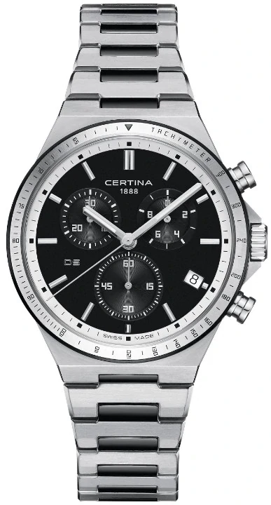 Certina DS-7 Chronograph C043.417.22.051.00 jsou pánské bateriové hodinky na kovovém integrovaném bicolor náramku s motýlkovou sponou. Pouzdro z nerezové oceli má průměr 41 milimetrů a pevnou lunetu s tachymetrickou stupnicí, kterou lze v kombinaci se stopkami využít pro měření rychlosti pohybujících se objektů. Na dýnku najdeme logo ve tvaru želvy, které reprezentuje robustnost a dlouhou životnost hodinek Certina. Černý číselník s indikací data a funkcí chronografu je chráněn odolným safírovým sklem s antireflexní vrstvou. Aplikované hodinové indexy jsou stejně jako ručky pokryty luminiscenčním nátěrem Super-LumiNova®, který garantuje perfektní čitelnost za zhoršených světelných podmínek. Pohon hodinek zajišťuje quartzový strojek ETA G10.212 s technologií Precidrive s přesností +/- 10 sekund za rok a indikací slabé baterie. Model disponuje technologií DS (Double Security) používanou a zdokonalovanou již od roku 1959, díky které mají hodinky zvýšenou odolnost vůči nárazům a vodě. Vodotěsnost hodinek činí 10 ATM a jsou tedy vhodné pro koupání nebo šnorchlování.